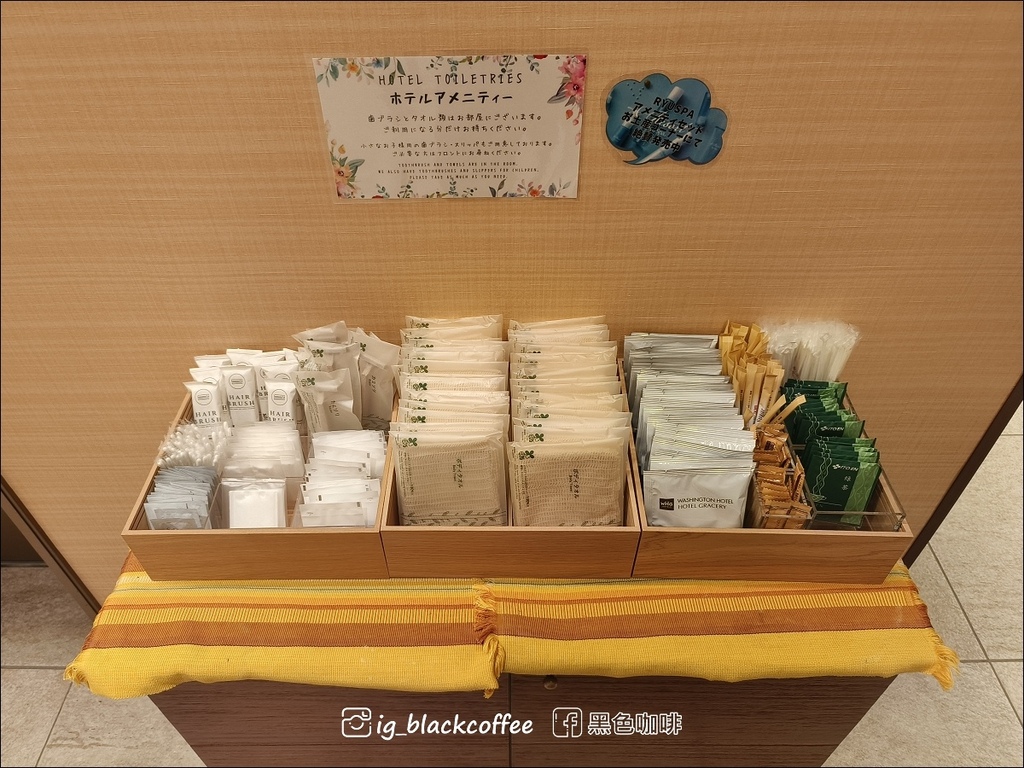 電梯旁有盥洗用具,包含洗面乳、化妝棉、梳子、沐浴巾、刮鬍刀,還有咖啡、砂糖、奶精,全部自由拿取