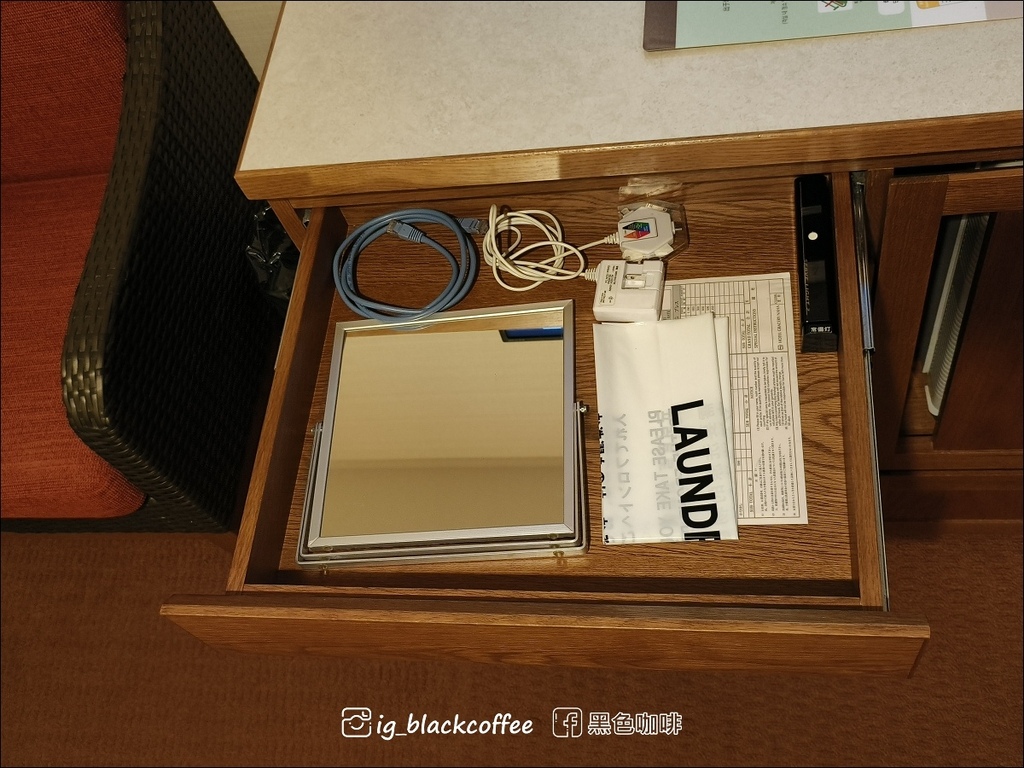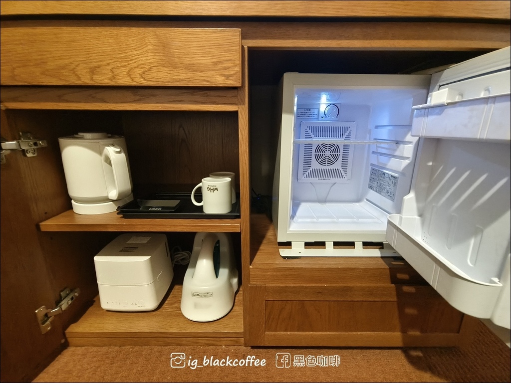 電視櫃內有冰箱、加熱式水壺、茶杯,第一次看到竟然還有熨斗和加濕器
