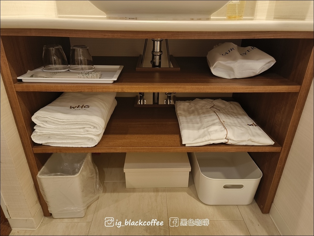 洗手台下方擺放盥洗用品、Panasonic NA27 吹風機、毛巾、睡衣、垃圾桶、置物籃