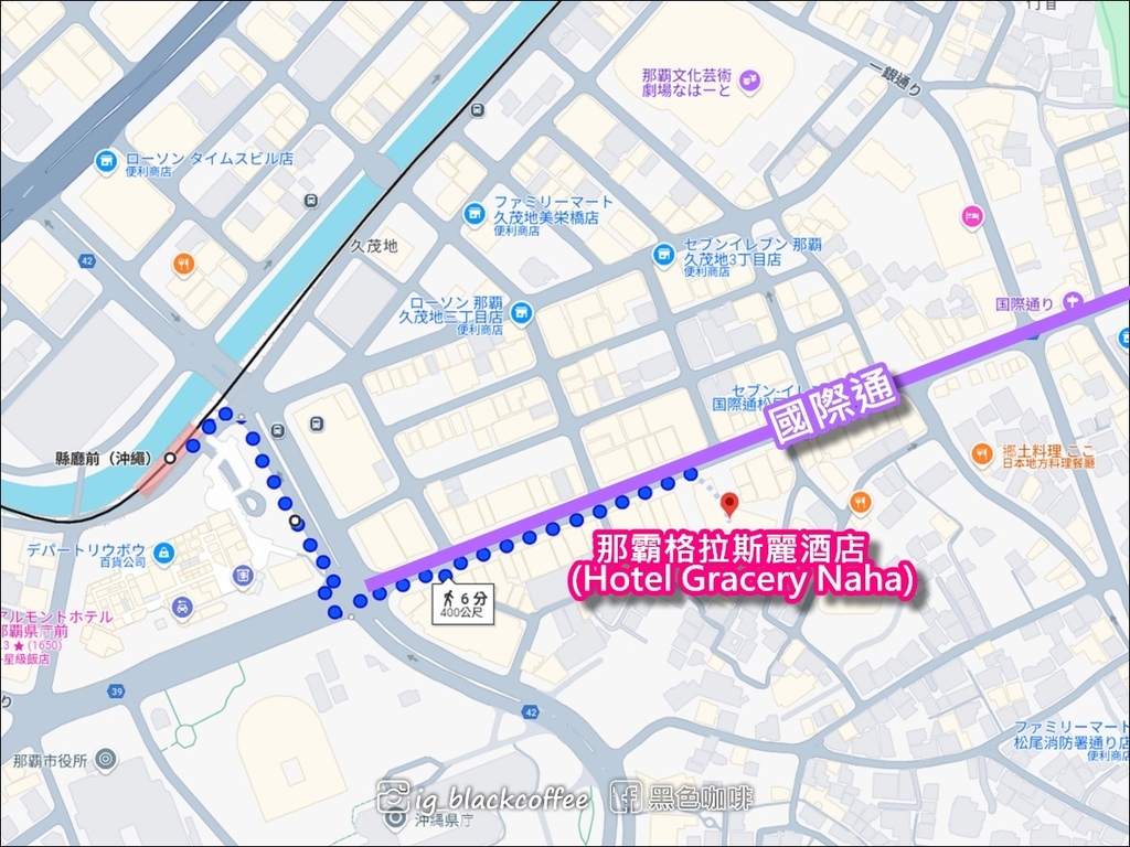 2016 年開幕的 那霸格拉斯麗酒店 (Hotel Gracery Naha)(查最低房價),距離單軌電車「県庁前駅」步行約 6 分 (400公尺),就位於熱鬧的國際通大街上,藥妝店對面有札幌藥妝、左邊有大國藥妝、右邊有驚安殿堂唐吉訶德國際通店,非常方便!
