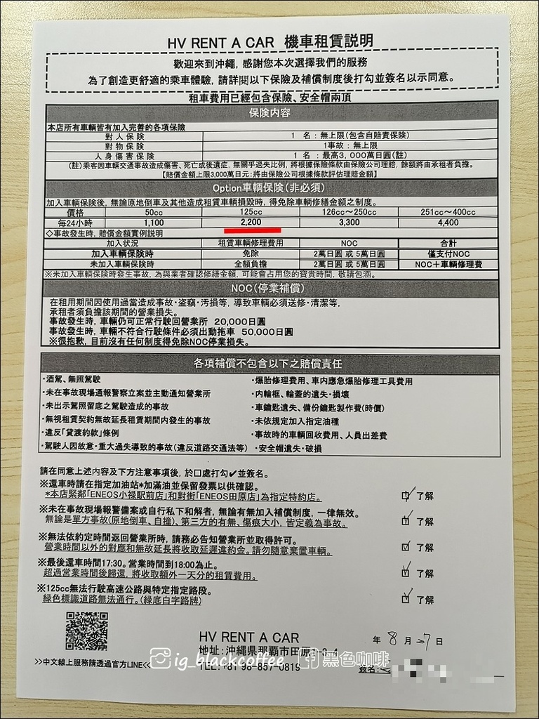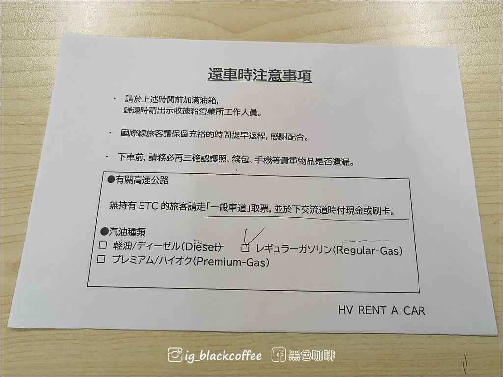 租車合約只有簽這一張 A4 紙,合約內容沒有霸王條款,也有給我一份與甲方合約相同的副本,不會日文沒關係,英文也可以通,或是使用 Google 語言即時翻譯,溝通無障礙