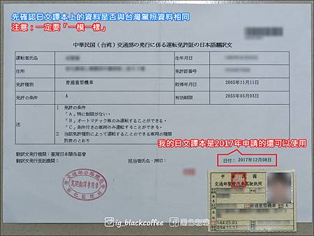必須注意的是「先確認日文譯本上的資料是否與台灣駕照資料相同,一定要一模一樣,除了日文譯本的申請日期(日付)」,台灣駕照是有效期限是「====」,日文譯本上有效期限也必須是「====」。
