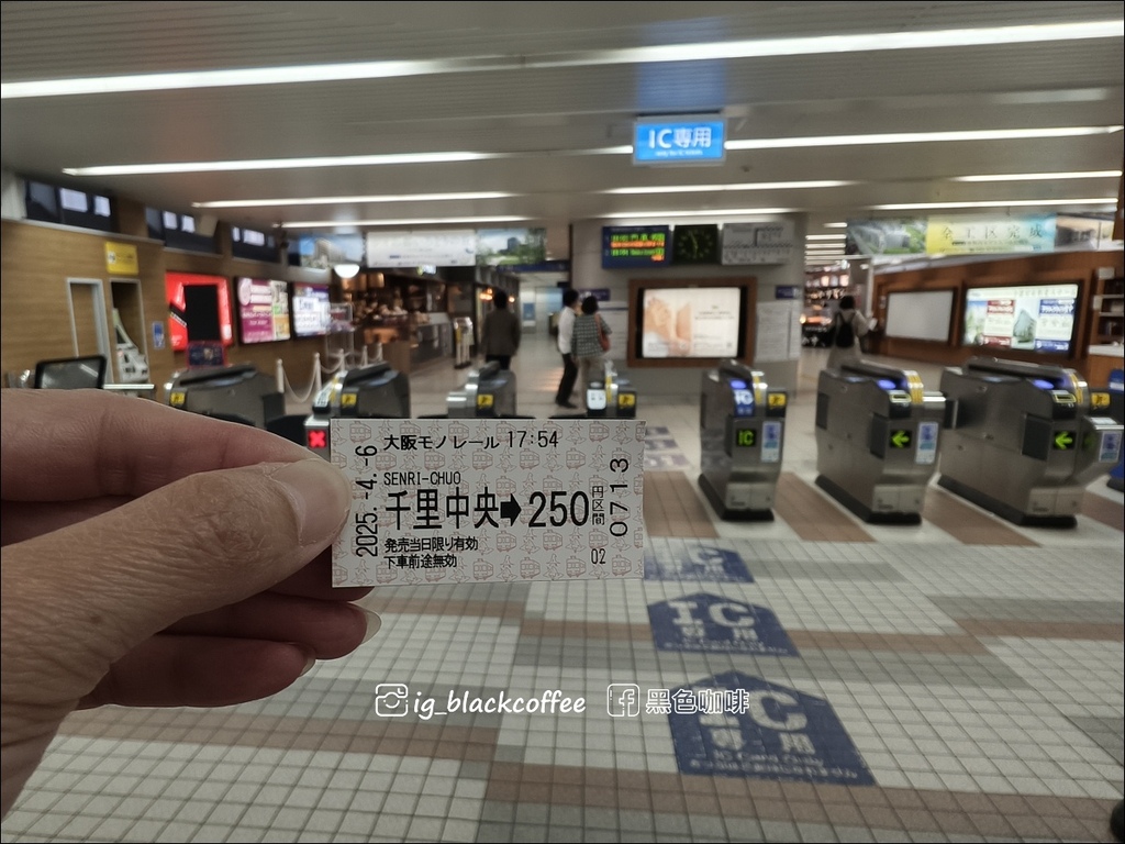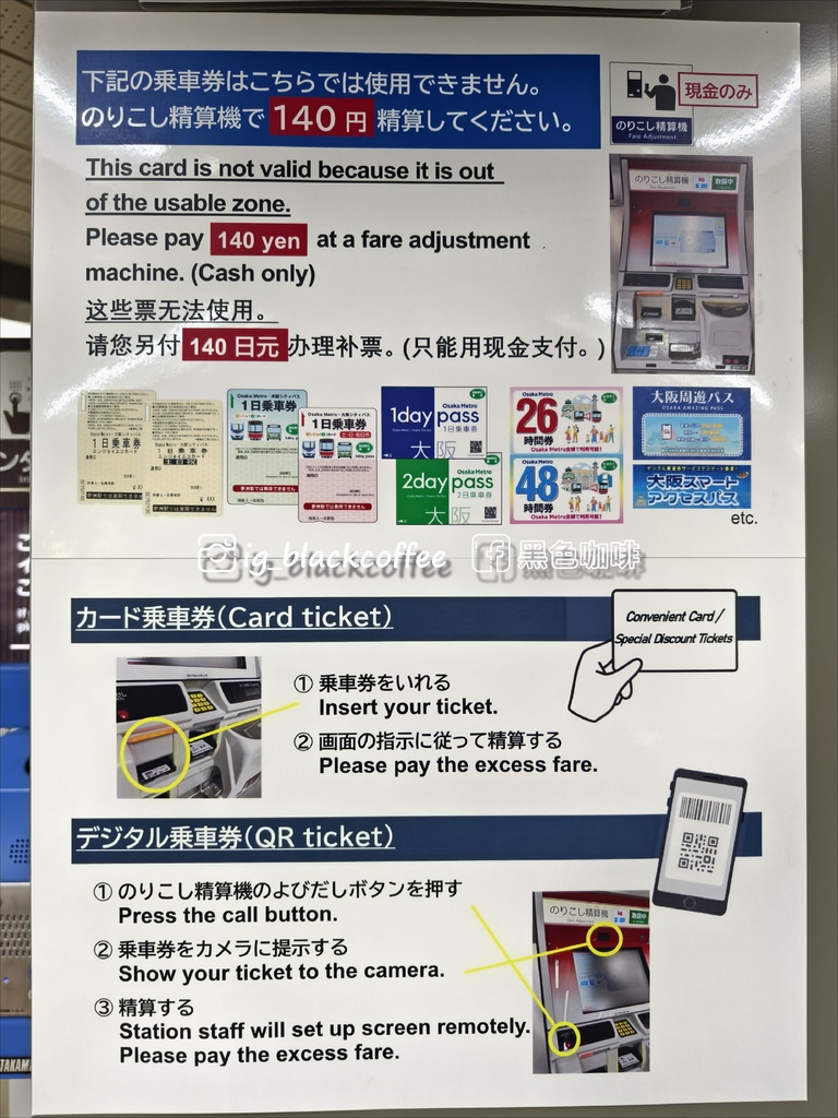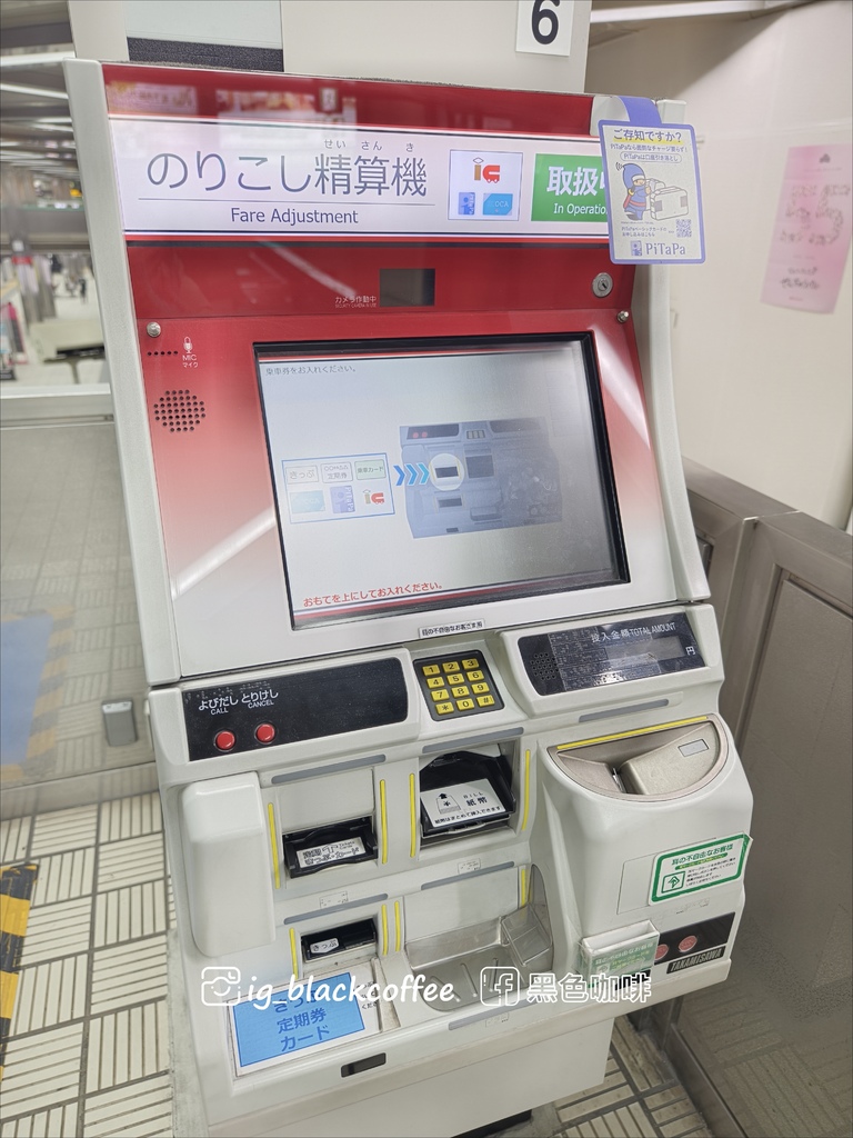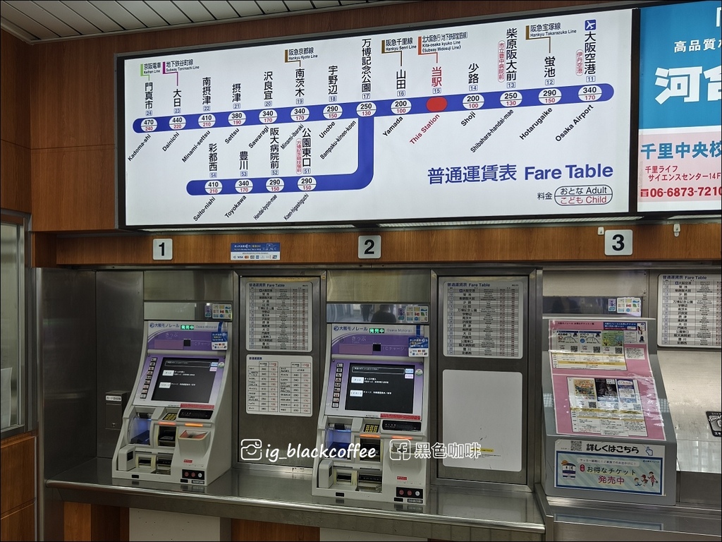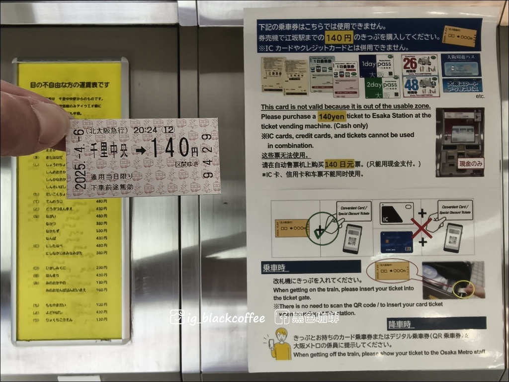 「千里中央駅」出站前,必須在票匣出入口旁,透過「のりこし精算機」呼叫站務人員,出示「大阪地鐵・巴士一日券」進行補票 140 円
